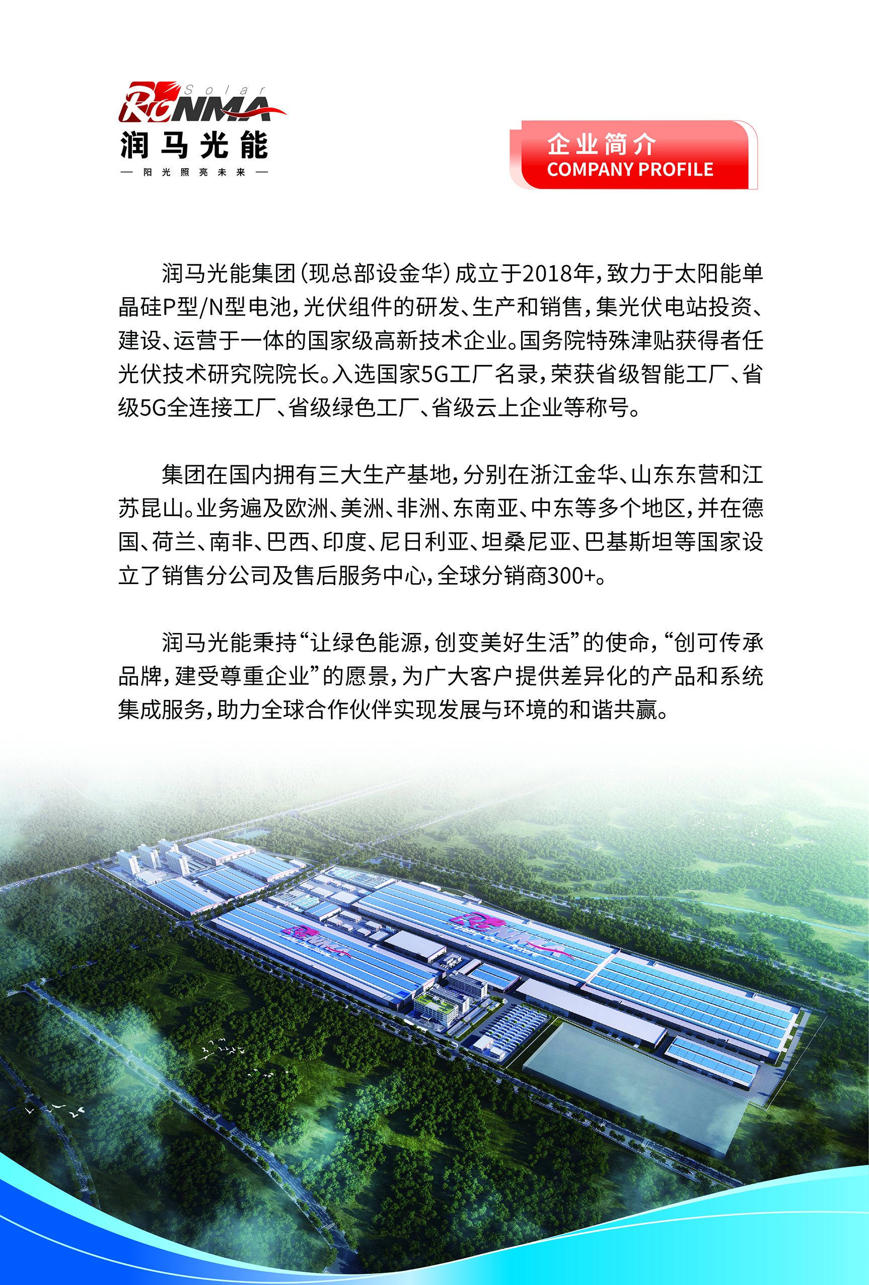 润马光能集团(现总部设金华)成立于2018年,致力于太阳能单晶硅P型/N型电池,光伏组件的研发、生产和销售,集光伏电站投资、建设、运营于一体的国家级高新技术企业。国务院特殊津贴获得者任光伏技术研究院院长。入选国家5G工厂名录,荣获省级智能工厂、省级5G全连接工厂、省级绿色工厂、省级云上企业等称号。